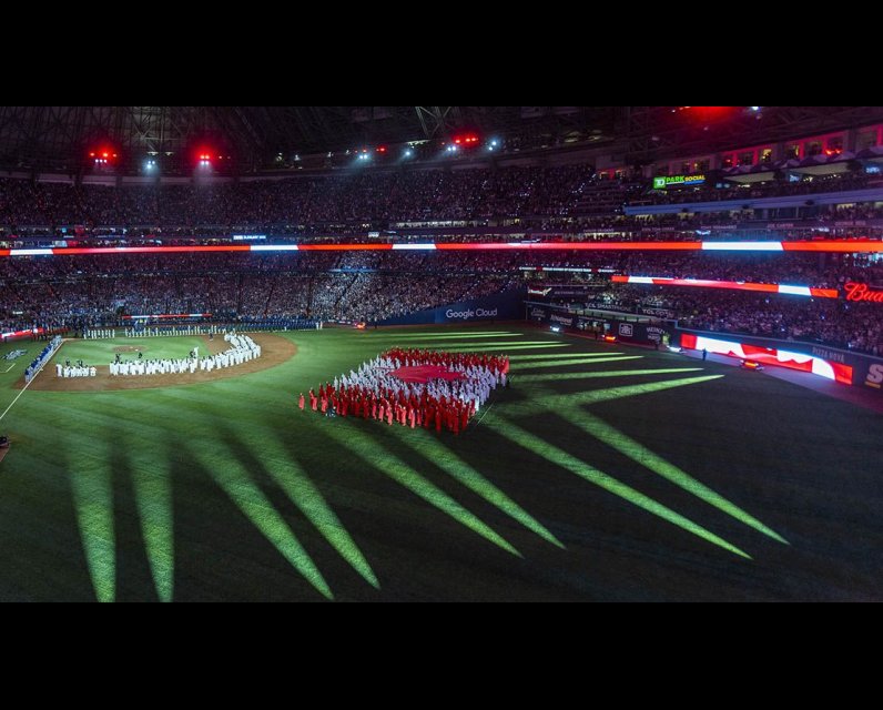 At the opener in Toronto, a high bar was set by the spectacle of 500 robed singers and musicians out on the field. Voices of Fire, a U.S. choir, sang both anthems and they were joined for O Canada by an orchestra of Toronto musicians.