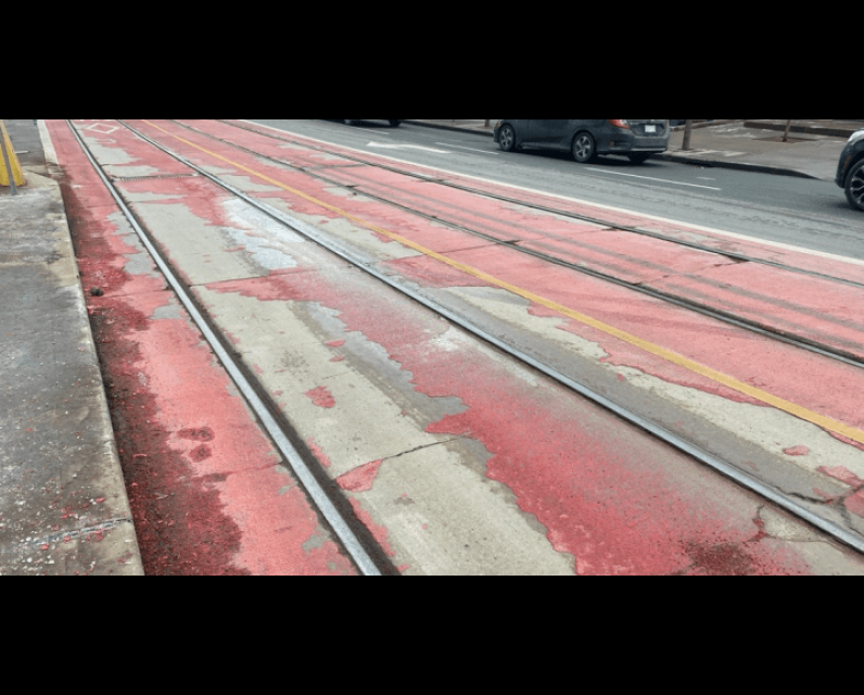 Bright red paint was applied to lanes on Bathurst and Dufferin streets in the fall to mark priority lanes for buses and streetcars.