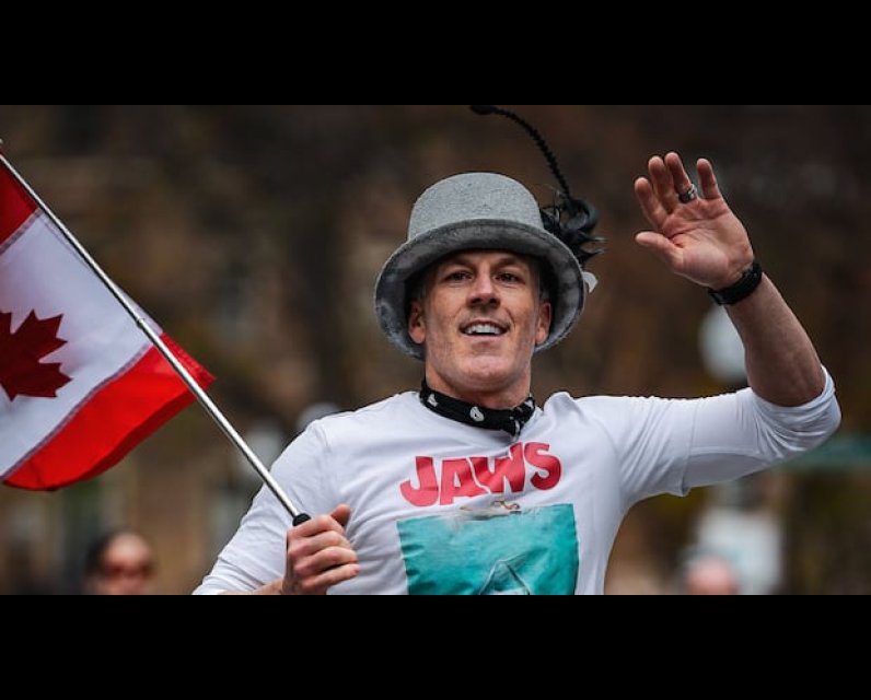 Firefighter Joseph Reid ran the prestigious marathon dressed in silver pants, a Jaws T-shirt, and a grey top hat adorned with a feather — the same outfit the late Tragically Hip frontman wore for his final concert in Kingston, Ont., in 2016.