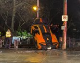 One person has been arrested for impaired driving after a supercar crashed and was stuck propped up against a wall outside Casa Loma.