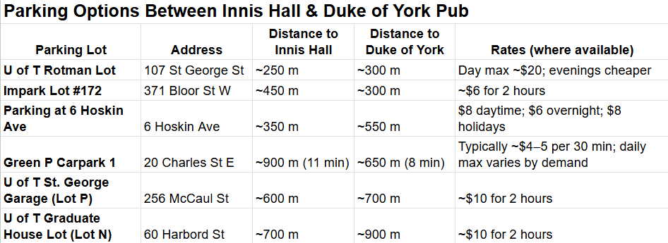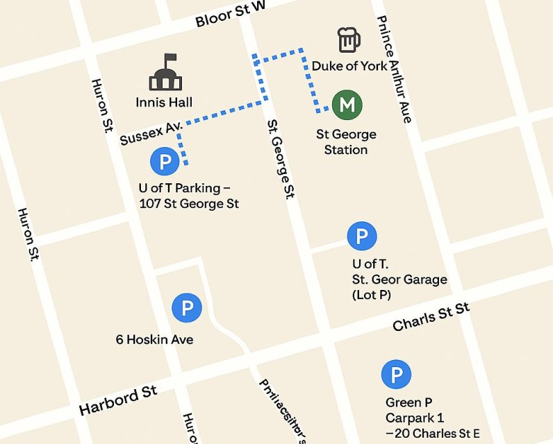 Innis Town Hall located steps away from St. George TTC subway station, best way is to take transit. We do understand not everyone lives close to the transit system, so here is a quick guide on where to park in the area.